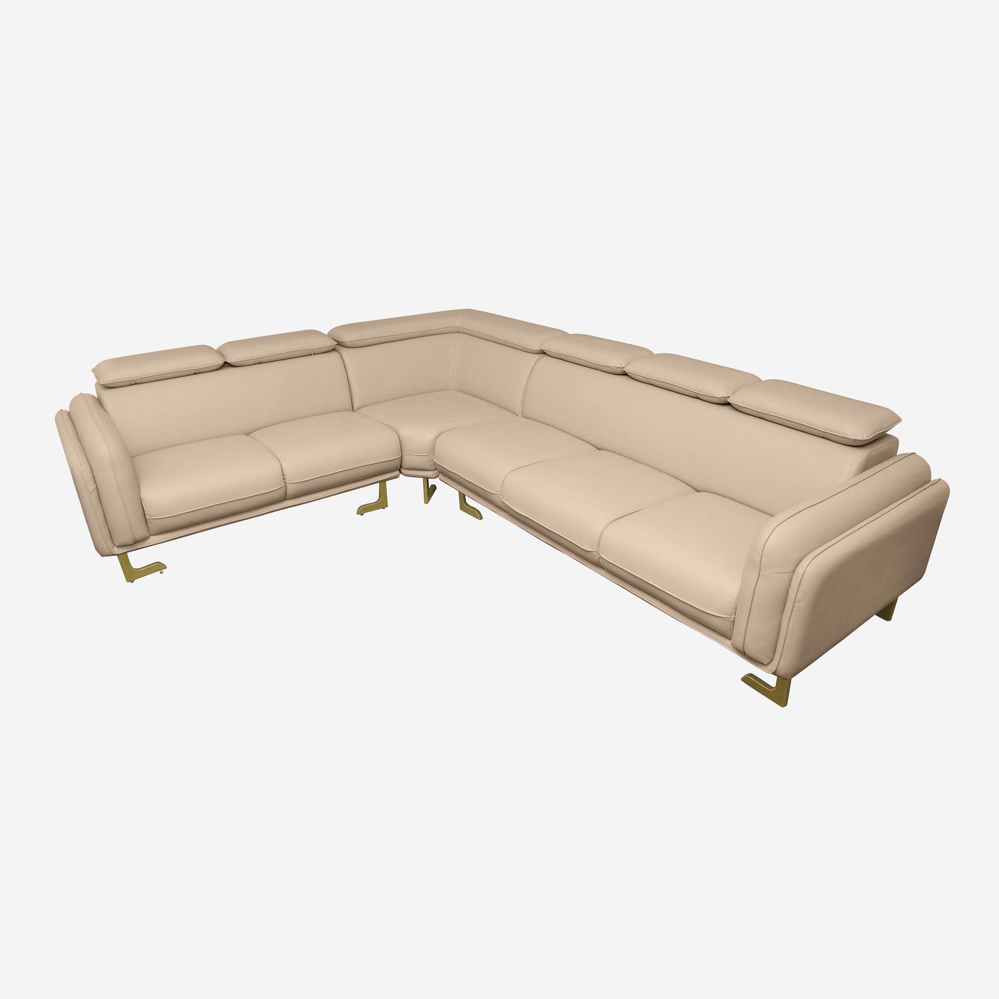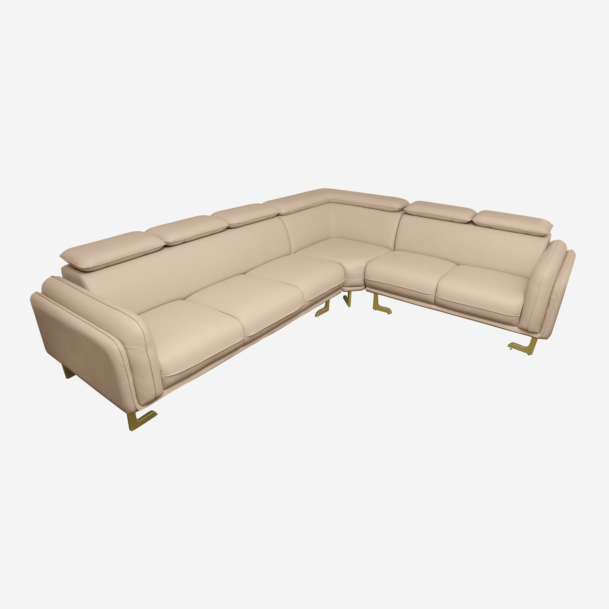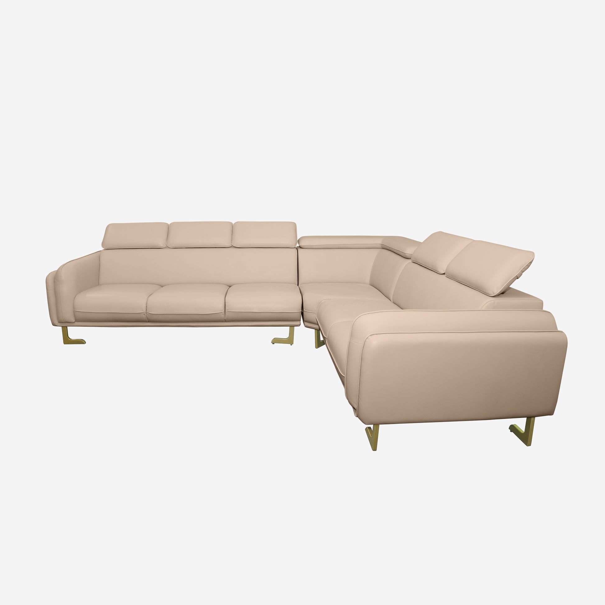 Finished in fully customizable Rexine leather colors with contemporary metal legs and adjustable headrest functionality, this sectional is a versatile, stylish, and adaptable centerpiece for any modern living room.
