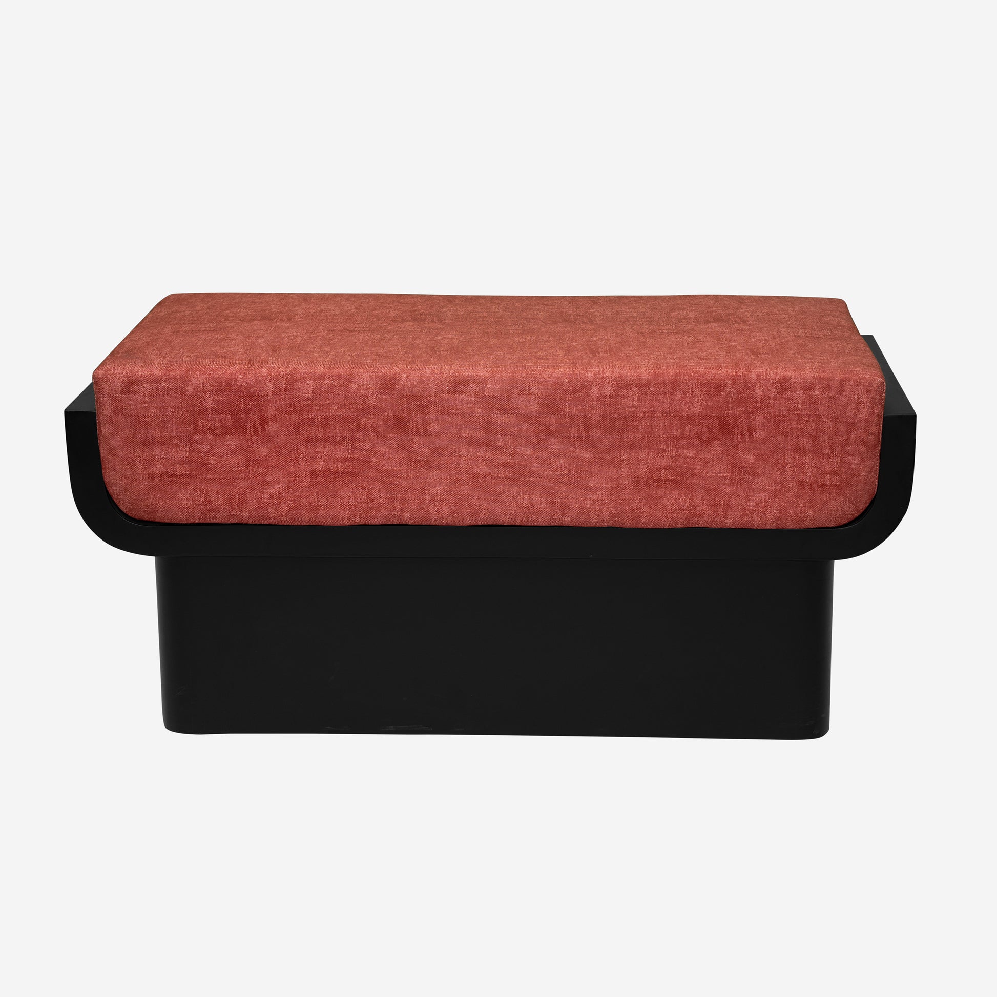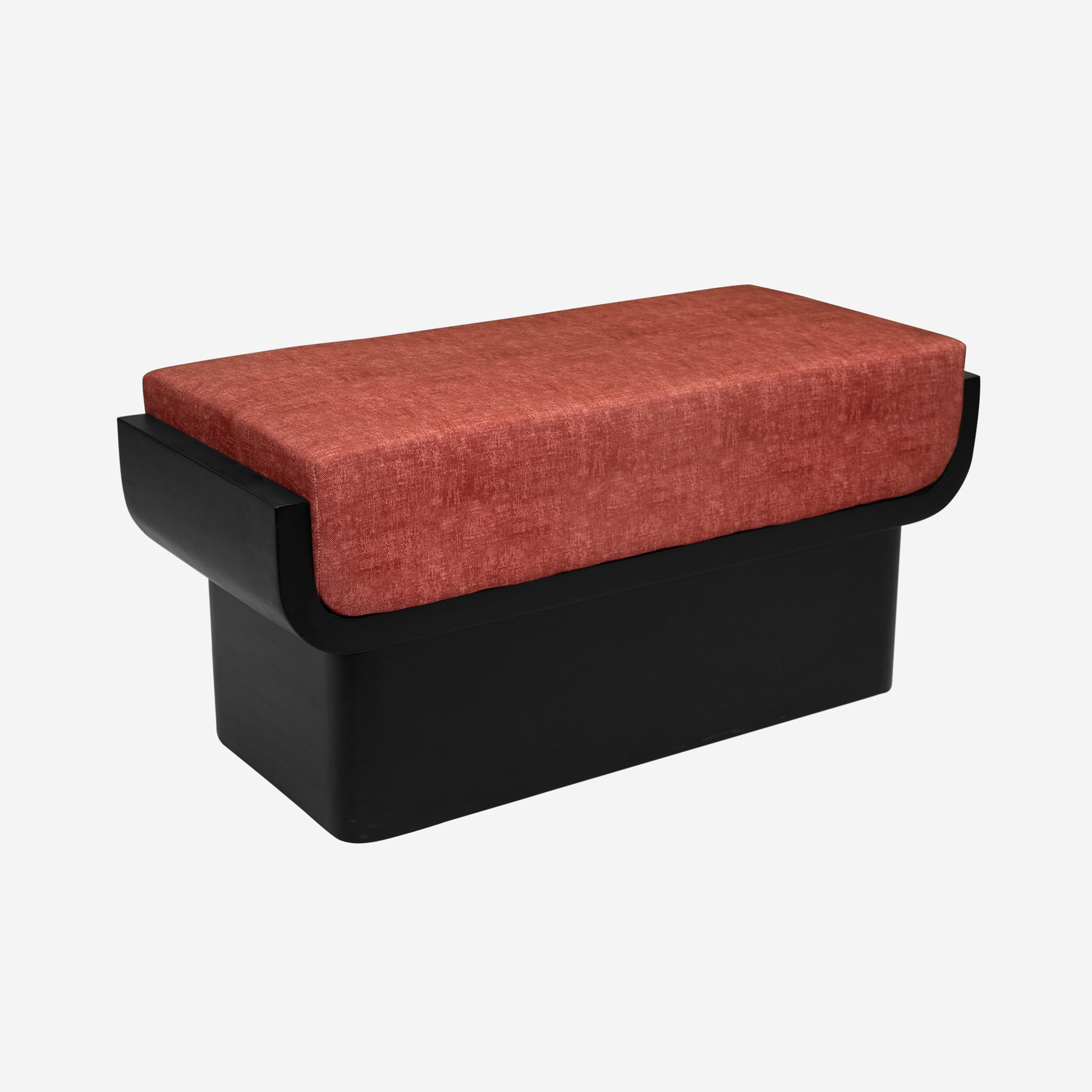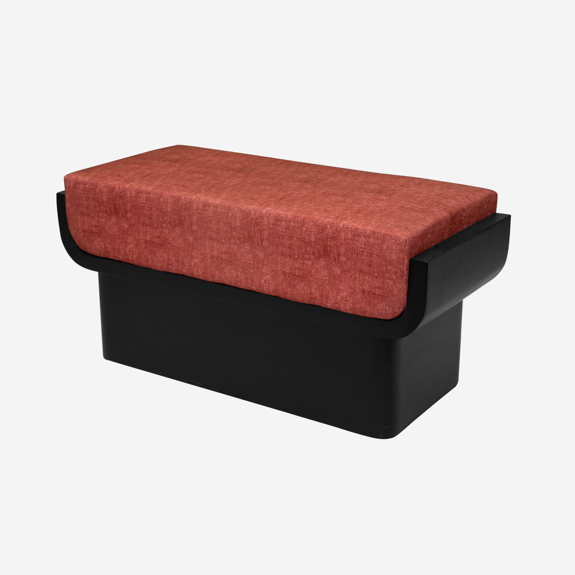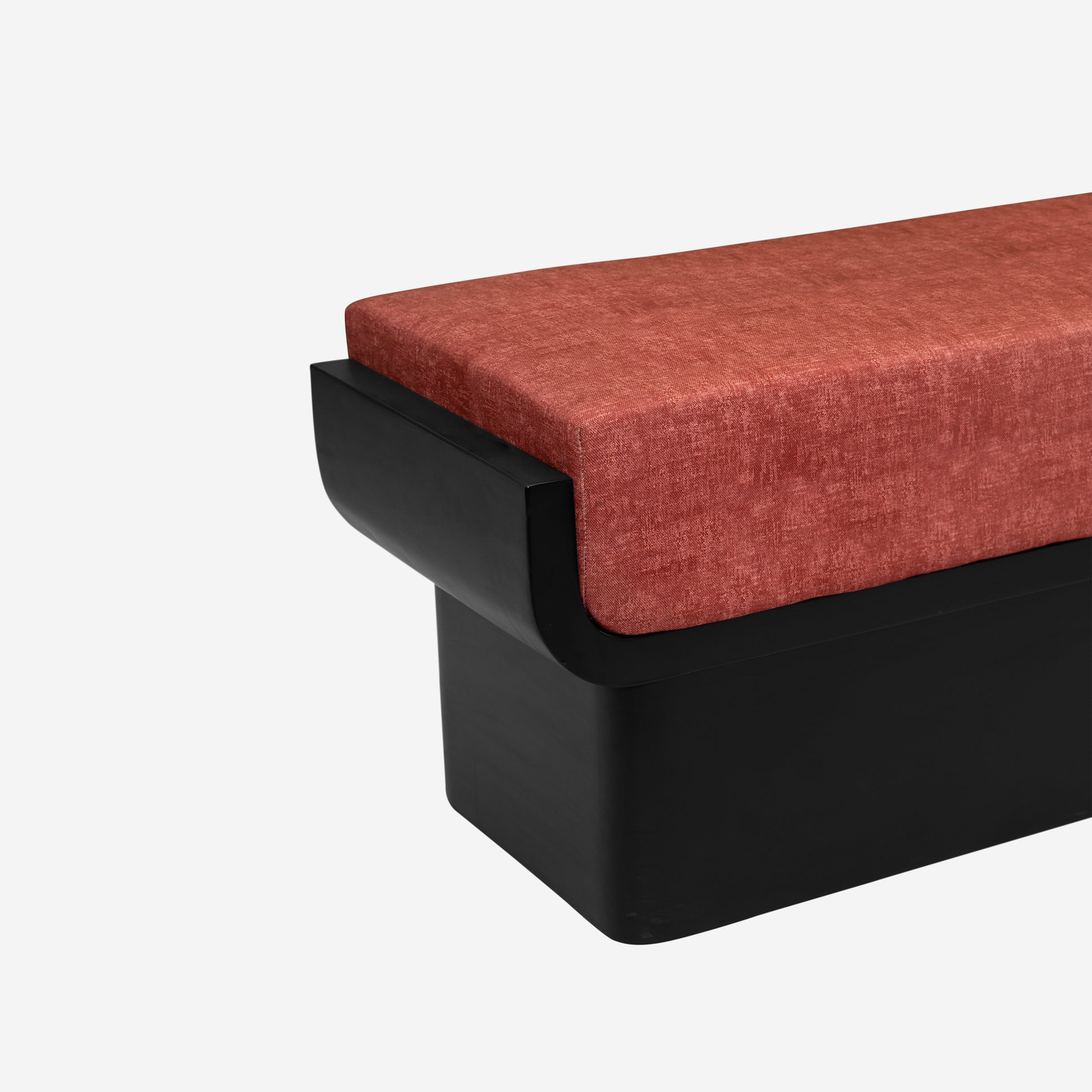 Built on a strong veneered wood base, the bench features smooth curves and a bold modern silhouette that enhances visual appeal. The contrasting black base with maroon upholstery offers a striking aesthetic, and with fully customizable fabric and polish options, the Rivon Bench can be tailored to match any interior style
