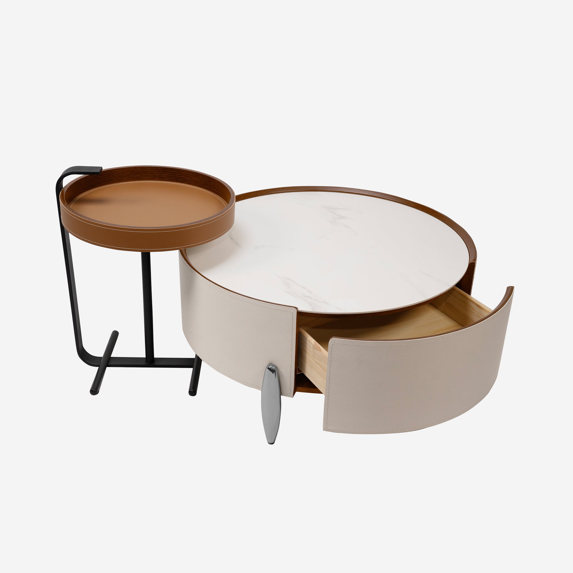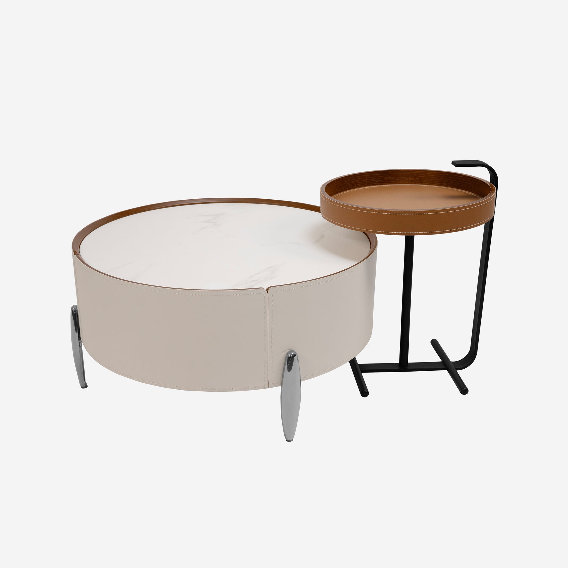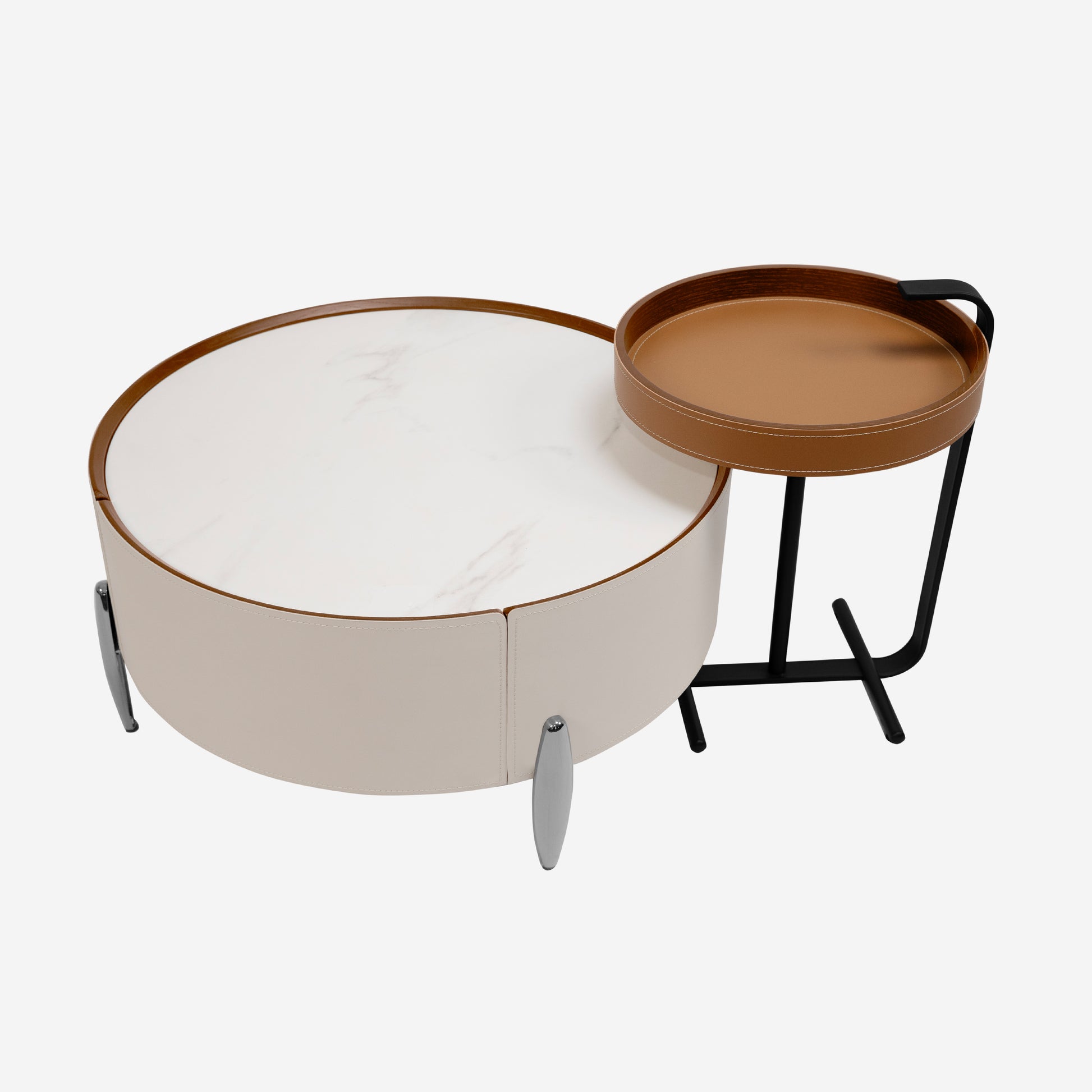 The larger table features a luxurious marble top with a glossy finish and an elegant Rexin-wrapped exterior that conceals hidden storage, while the smaller wood-topped table offers a matte finish for contrast. Both are scratch-resistant and incredibly easy to clean and maintain, ideal for busy households. Designed for superior durability, the set features metal bases with PVD coating and PU color protection that resist wear while providing stable support throughout daily use.